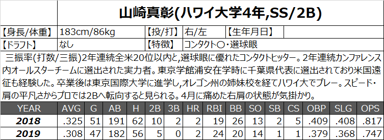 楽天が「隠し玉」として、ハワイ大・山崎真彰内野手(4年)の指名を検討していることが16日、分かった。
